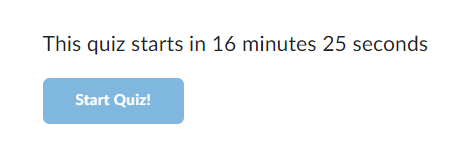 For a student taking a synchronous quiz, the Start Quiz button is disabled until the start date and time comes. A countdown timer appears on the Quiz Start page indicating the time left before the quiz becomes available.