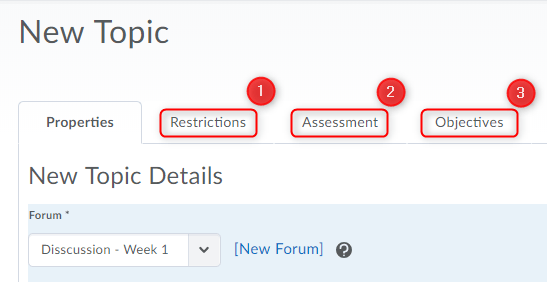 Objectives – If you are using the competency tool, you can associate learning objectives to the discussion topic. More detail of objectives can be found under the competencies module.