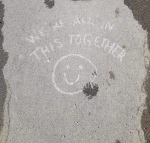“I am attaching a picture I took while on our daily walk-about in the neighborhood. Someone had chalked this message on the sidewalk and it sure felt good to read. Such a small act, yet capable of uplifting many spirits!”