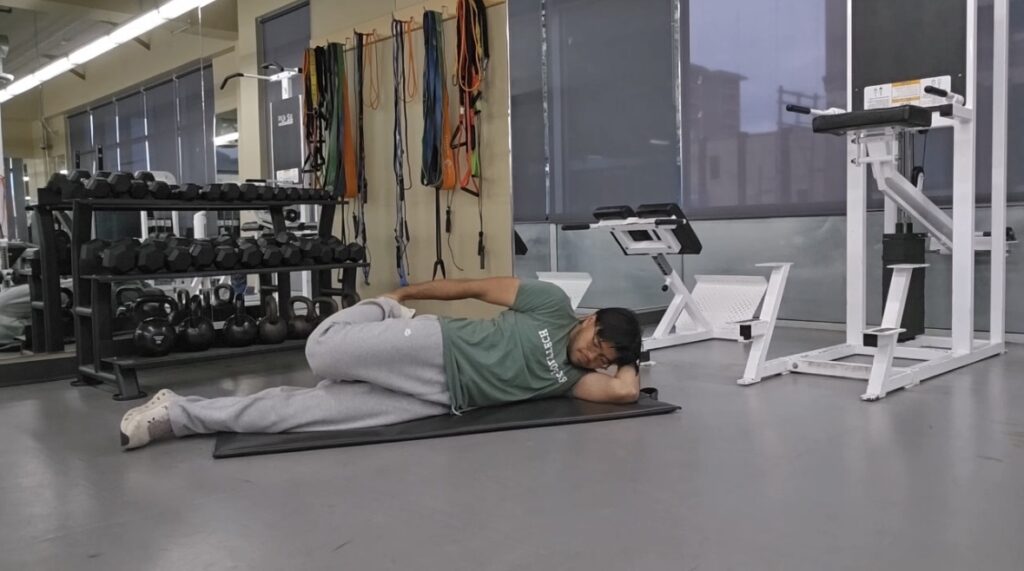 Lie on your side with your legs stacked and your head supported by your bottom arm.